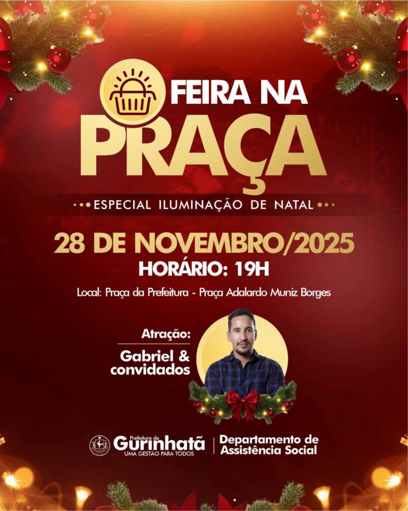 Nesta sexta-feira, dia 28, a Prefeitura e o Departamento de Assistência Social realizam mais uma Feira na Praça, em uma edição especial com o acendimento da Iluminação de Natal.