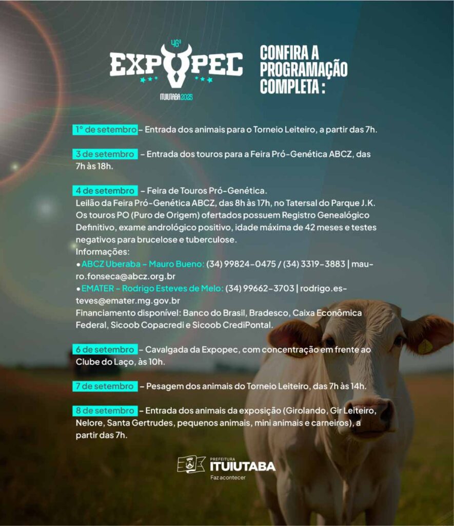 A Prefeitura de Ituiutaba anuncia a programação oficial da Expopec 2025, tradicional feira agropecuária da região que reúne expositores, produtores rurais e visitantes de diversas partes do país. O evento acontece no Parque de Exposições JK e promete movimentar o setor agropecuário, além de oferecer uma agenda diversificada de rodeios, leilões e shows musicais.